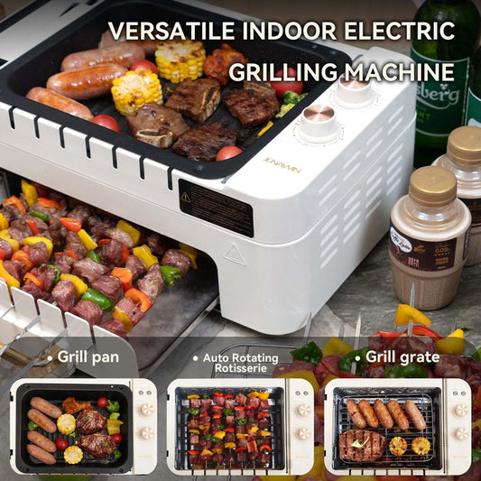 Indoor Grill Electric Smokeless - Indoor Tabletop BBQ Grill with Grill Pan & Grill Grate,Smokeless Rotating Rotisserie Grills for Kabob Skewers,Dual Zone Cooking,Removable,Temperature Control